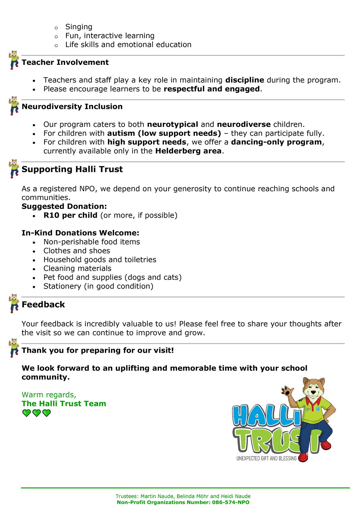 We would appreciate a R10/or more contribution from the children towards a Halli Visit, alternatively a goods donation will be appreciated.