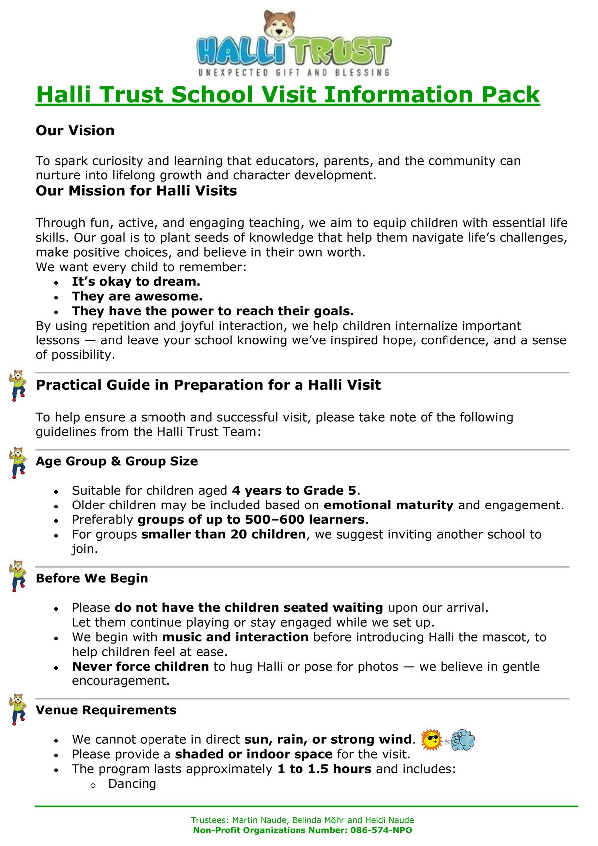 A Halli Visit Booking Form must be completed, when booking a Halli Visit (bookings need to be made at least 2 weeks in advance, plan your year and book your visits with us for the year)